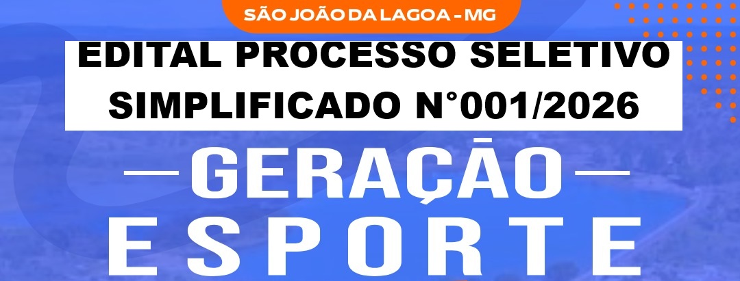 O MUNICÍPIO DE SÃO JOÃO DA LAGOA – MG, por intermédio do Prefeito Municipal, no uso de suas atribuições legais, torna publica a abertura de Processo Seletivo Simplificado, destinado a contratação de profissionais para atendimento de necessidade temporária de excepcional interesse público, nos termos do art. 37, inciso XI, da Constituição Federal, da Lei Municipal N° 556/2026, do Edital SEDESE n° 04/2025, do Plano de Trabalho N° 001821/2025 e do Convênio de Saída N° 1481001265/2025, firmado com a Secretaria de Estado de Desenvolvimento Social de Minas Gerais – SEDESE, para execução do Programa Geração Esporte no âmbito do Município de São João da Lagoa/MG.